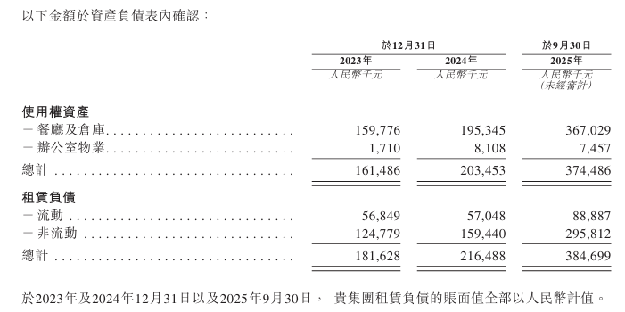 截至2025年9月末,公司归并资产总额9。01亿元,较2024岁暮增加62。6%,同期,公司非流动资产总额达到6。56亿元,较2024岁暮近乎翻倍。此中,利用权资产(即门店持久租赁权)从2024岁暮的2。03亿元激增至3。75亿元,增幅84%,反映的即是线下门店收集的迅猛铺设。取此同时,物业、厂房及设备从1。12亿元增加至2。4亿元,增加率114%,反映出其正在地方厨房、出产设备等后端根本设备上的持续沉投入。